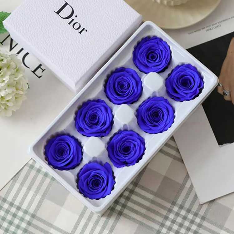 Rosae gradus sunt in tres gradus: A, B, C. Gradus A rosae maiores et pleniores sunt. Noster perpetuus Flos 8 florum Rose Gift Box fiunt cum Grade A rosis. Donum capsulae dimensiones sunt 24cm*13cm*8cm. Quaelibet archa circiter 150g ponderat. Fasciae vita florum conservatorum: 3-5 annos sub condicionibus repositionis normalibus, quae utilior est ad venditiones tuas.