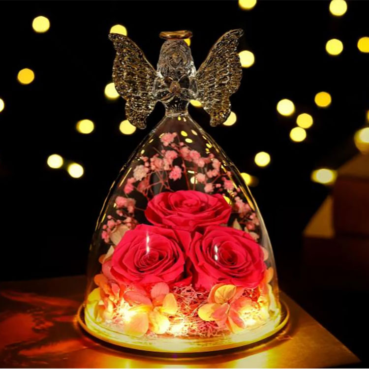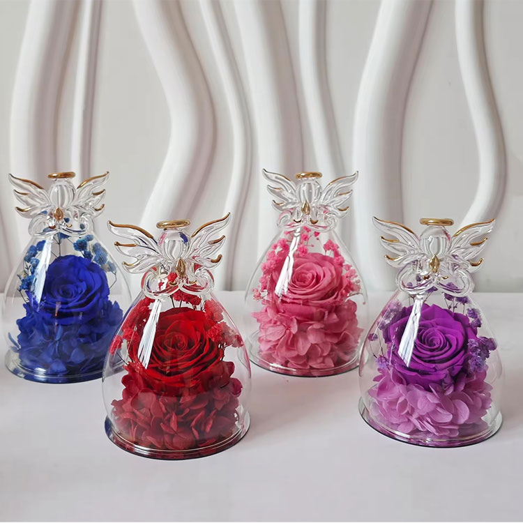 Flores conservati in nostro angelo vitreo conservati floris doni non artificiose synthesi sunt, sed ex realibus floribus factis. Novus dies plus XX annorum experientiae in officina productionis habet. Summus qualitatem, novos flores ex nostra plantatione basi, et processus utentes artificiis multiplicibus et subtilibus. Formam et colorem veri florum retinet, efficaciter vetat, et sinit flores florere usque ad 3-5 annos.