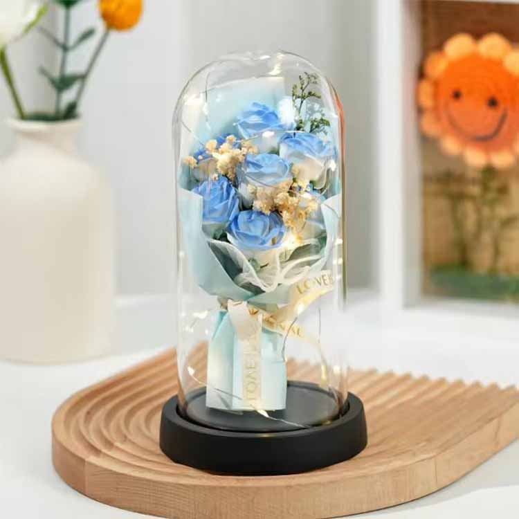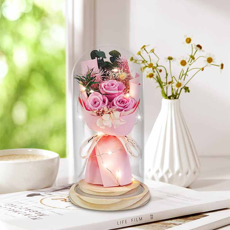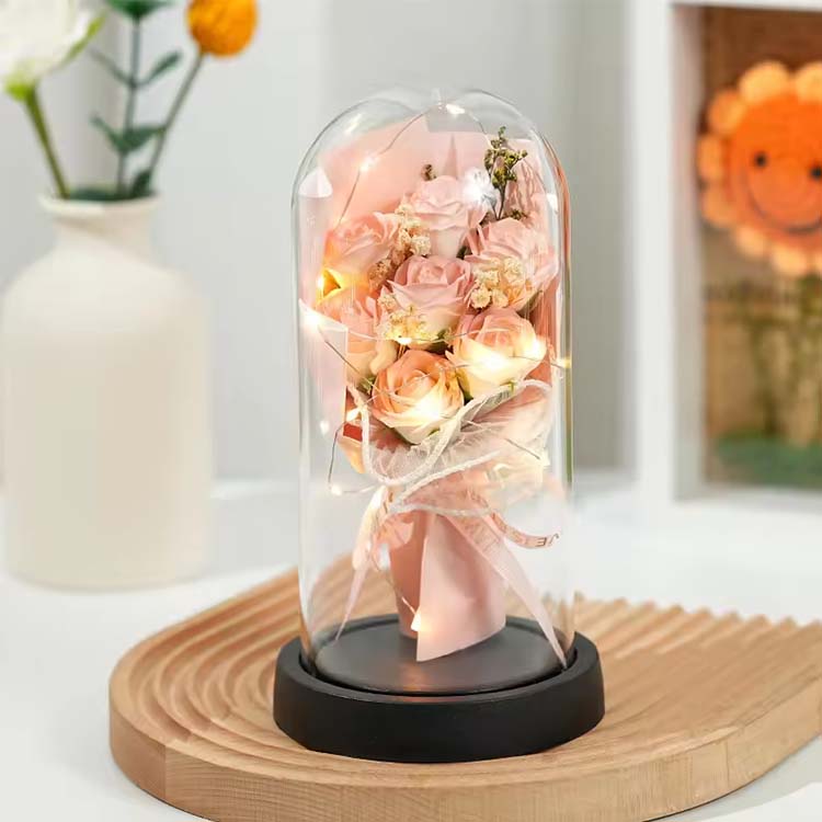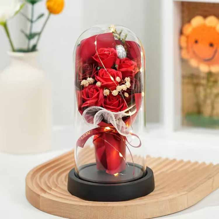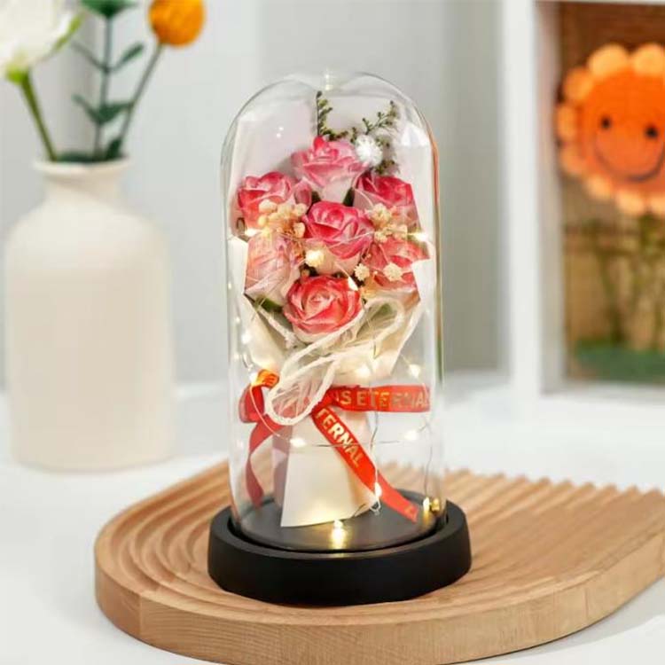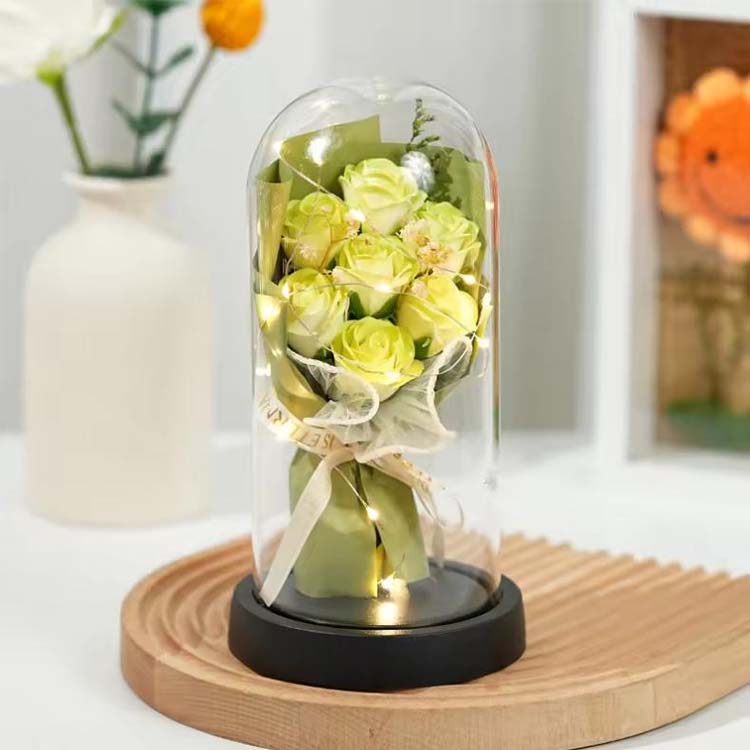 In testudine saponis rosae FLOS FLOS cum LED adhibetur in compositione cum sapone floribus et conservatis floribus. LED lumina utantur calidis et non-acrescentibus lumine, quae calidum atmosphaeram cum scenas decorantes addere possunt. Constructum-in ducatur chorda etiam varios luces micantes habet, et colores nativus ad necessitates tuas occurrere potest. Haec FLOS cum operculo vitreo ad scenas, sicut propositiones, etc. etiam dandum pro munere. Flores sempiterni non marcescent, nec colorem etiam vitreo operimento mutabunt. Flores saponis etiam ad manus lavandas vel ad odorem adhiberi possunt. Haec rosa FLOS frugi et practicus est.