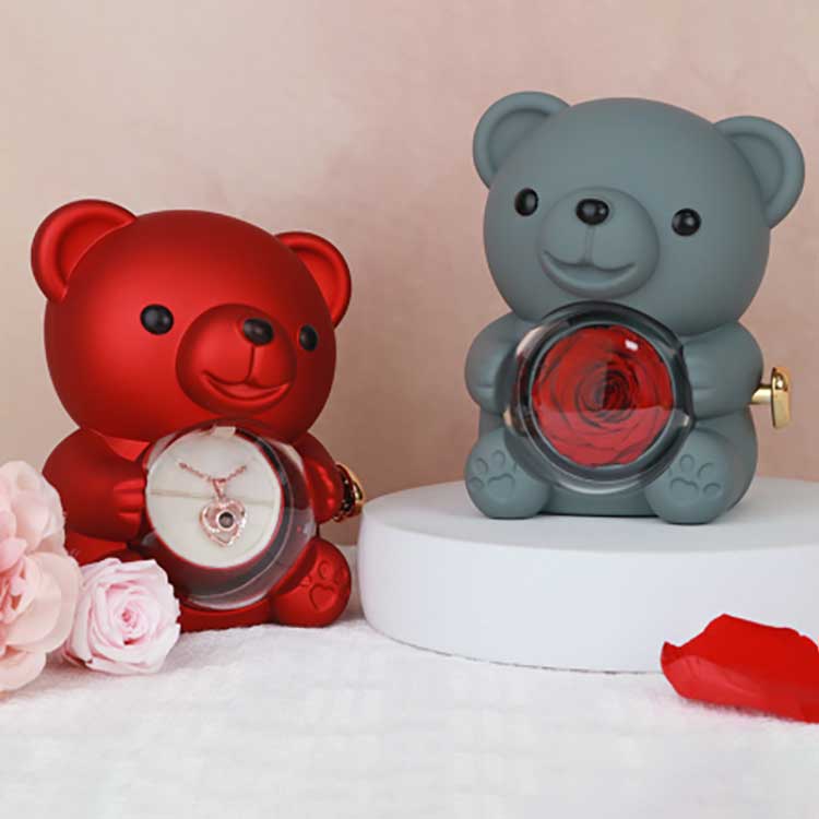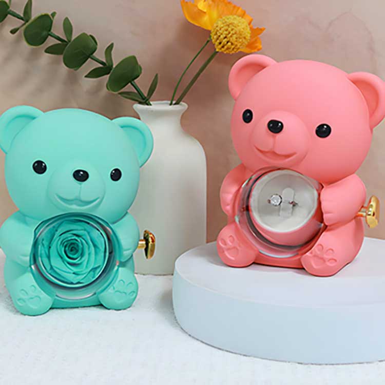 Hoc Hug Bear Rose ornamentum Box est ad ostentationem in scrinio, bookshelf, aut in mensa lecto. Oculi maxime apprehensionis in centro conservata rosa est. Rosa aperiens cellulam in ornamentis, anulis, vel custodibus recludit.