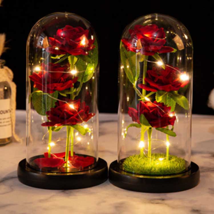 Intra testam vitream rosae sunt tres flores conservati diversis altitudinibus collocati, caulibus et frondibus viridibus realibus. Tegumentum vitreum est calor repugnans et non facile corrumpitur. Lumina ducta chorda aedificata sunt in molli lucendo et transitum sub basi lignea ad facilem operationem. Apta ad usum in ornamentis nuptialibus et in domo supellectili comprehendit, ac etiam donari potest sicut anniversarium donum vel dies natalis.